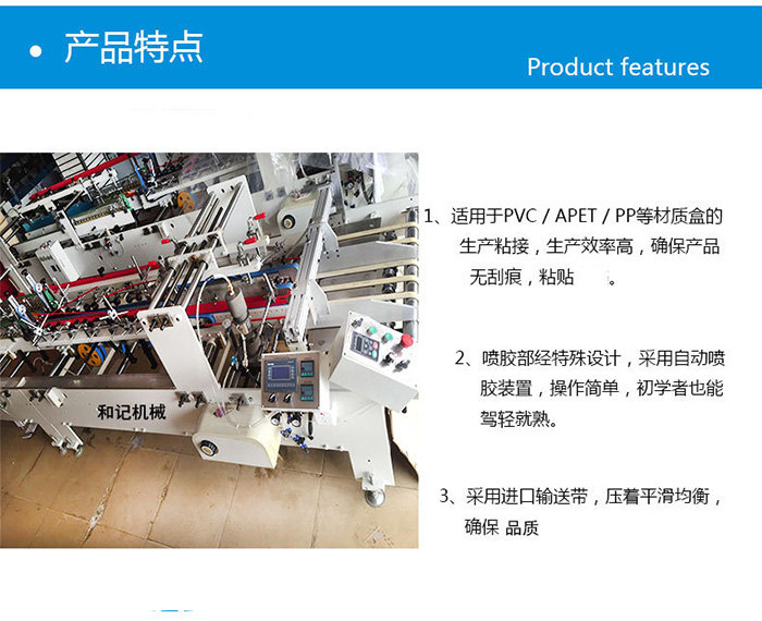 PVC PET PP PUR四合一(yi)全自動(dong)膠盒機(ji)。該機可(ke)以做到(dao)四種功(gong)能,(pvc銅針(zhen)頭裝置(zhi),pet噴霧裝(zhuang)置,pp熱風(feng)裝置,pur熱(re)熔膠裝(zhuang)置,其主(zhu)要的最(zui)大特點(dian)就是:自(zi)動折邊(bian),自動打(da)膠水,膠(jiao)盒裏面(mian)、外面、中(zhong)間都能(neng)粘接,針(zhen)對難粘(zhan)的pp材質(zhi)也同樣(yang)能粘接(jie),并且采(cai)用的是(shi)進口原(yuan)裝輸送(song)帶,壓着(zhe)平滑均(jun)衡,粘接(jie)無劃痕(hen),确保品(pin)質 PVC PET水性(xing)膠,PVC銅針(zhen)頭噴膠(jiao),PET噴槍自(zi)動感應(ying)噴膠 PP熱(re)風槍 PUR固(gu)體膠